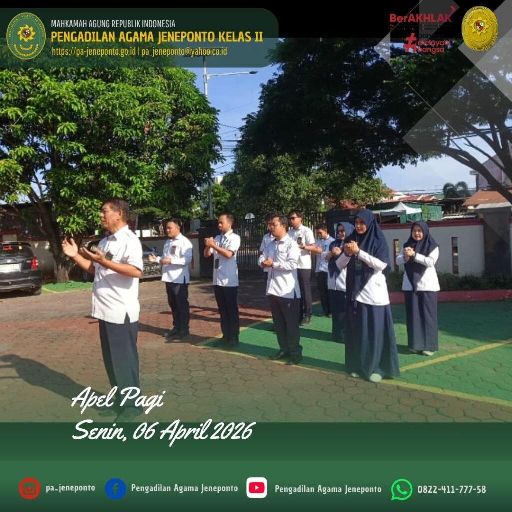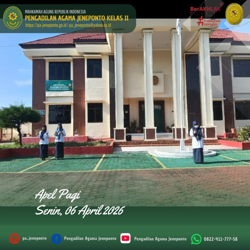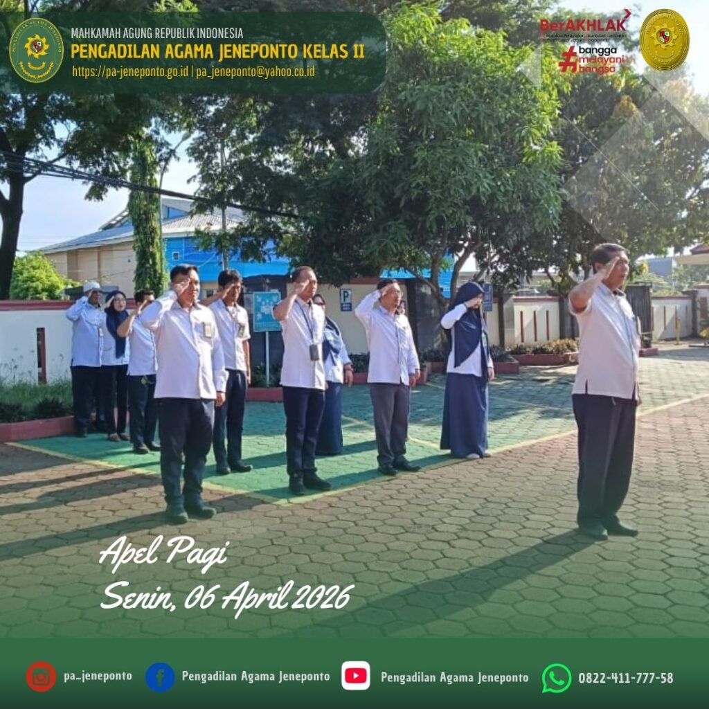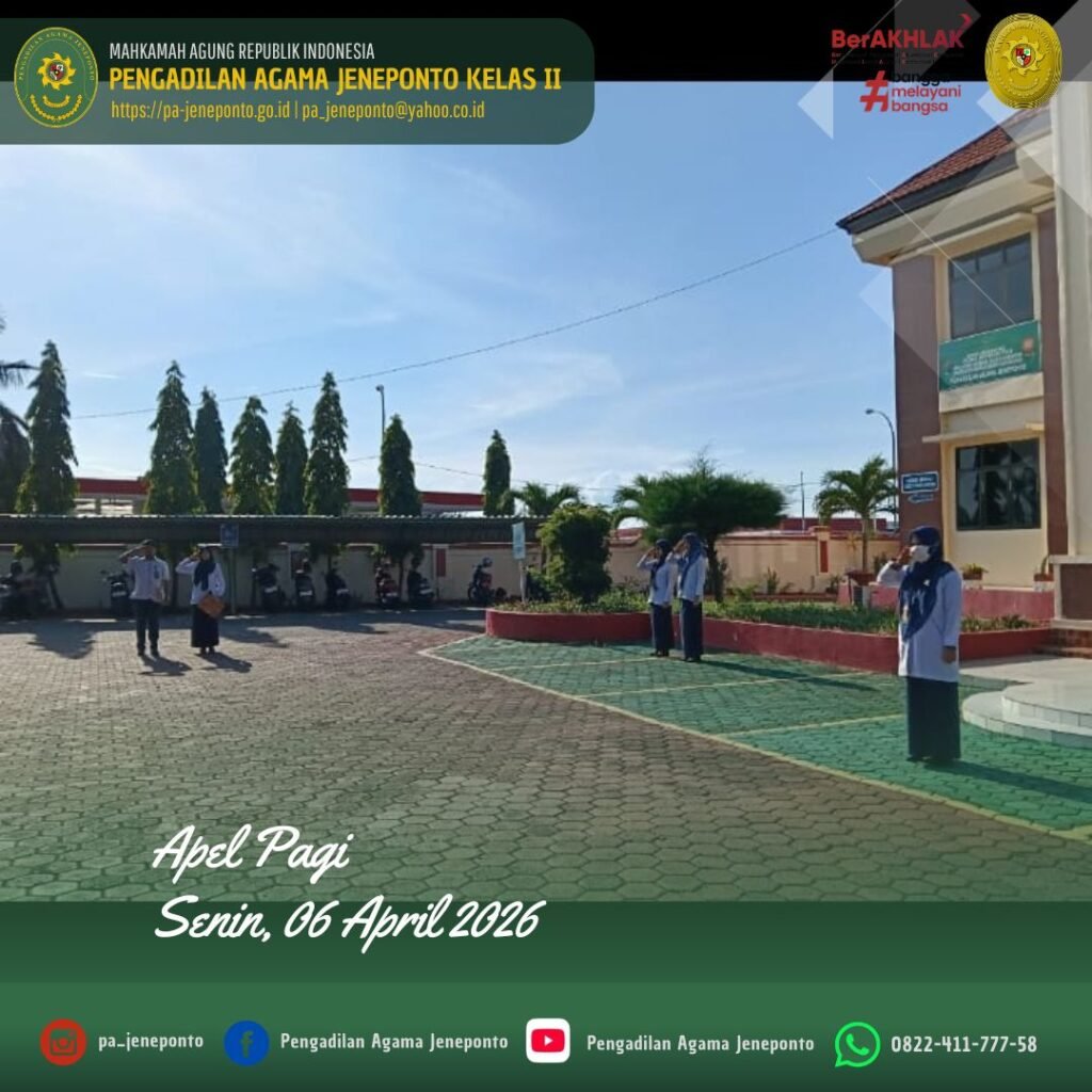 Apel Rutin setiap hari Senin Pagi yang diikuti oleh seluruh Aparatur Pengadilan Agama Jeneponto, dilaksanakan di Halaman Kantor Pengadilan Agama Jeneponto, yang bertindak sebagai Pembina Apel, Ruhana Faried, S.H.I.,M.H.I., Wakil Ketua Pengadilan Agama Jeneponto, Patta Jalo, Pemimpin Upacara, Peserta Upacara, Hakim, seluruh Pejabat Struktural dan Fungsional serta PPPK, dan CPNS Pengadilan Agama Jeneponto, dalam kesempatan tersebut Beliau menyampaikan beberapa hal.