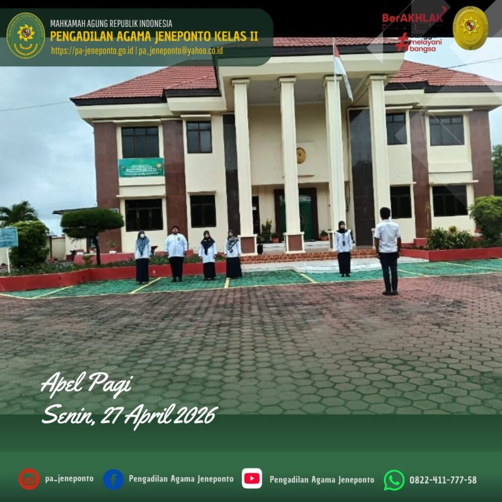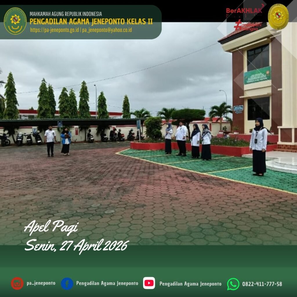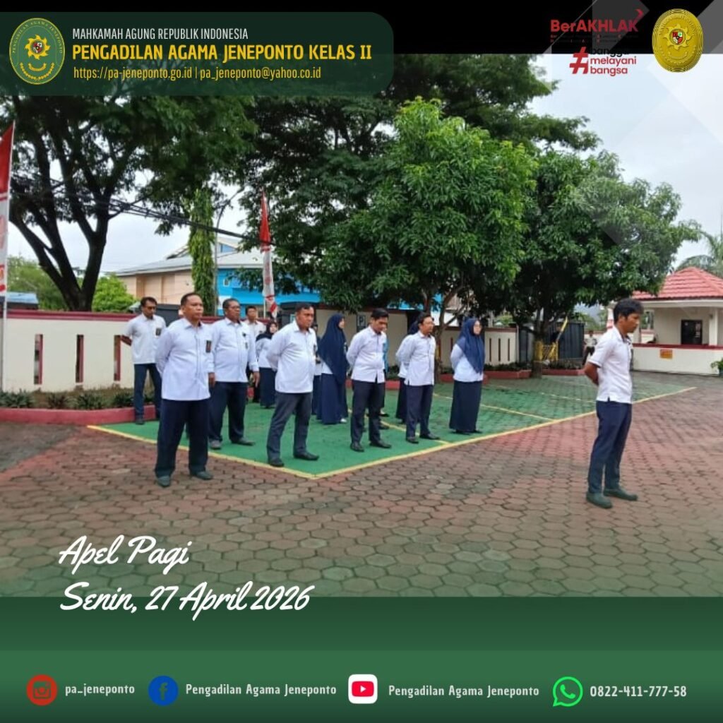 Apel Rutin setiap hari Senin Pagi yang diikuti oleh seluruh Aparatur Pengadilan Agama Jeneponto, dilaksanakan di Halaman Kantor Pengadilan Agama Jeneponto, yang bertindak sebagai Pembina Apel, Ulin Nadya Rif’atur Rohmah, S.H., M.H., Hakim Pengadilan Agama Jeneponto, Ahmad. B., Pemimpin Upacara, Peserta Upacara, Ketua, Wakil Ketua, Hakim, Panitera, Sekretaris, seluruh Pejabat Struktural dan Fungsional serta PPPK, dan CPNS Pengadilan Agama Jeneponto, dalam kesempatan tersebut Beliau menyampaikan beberapa hal.