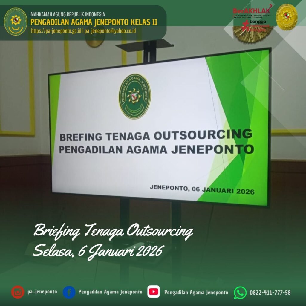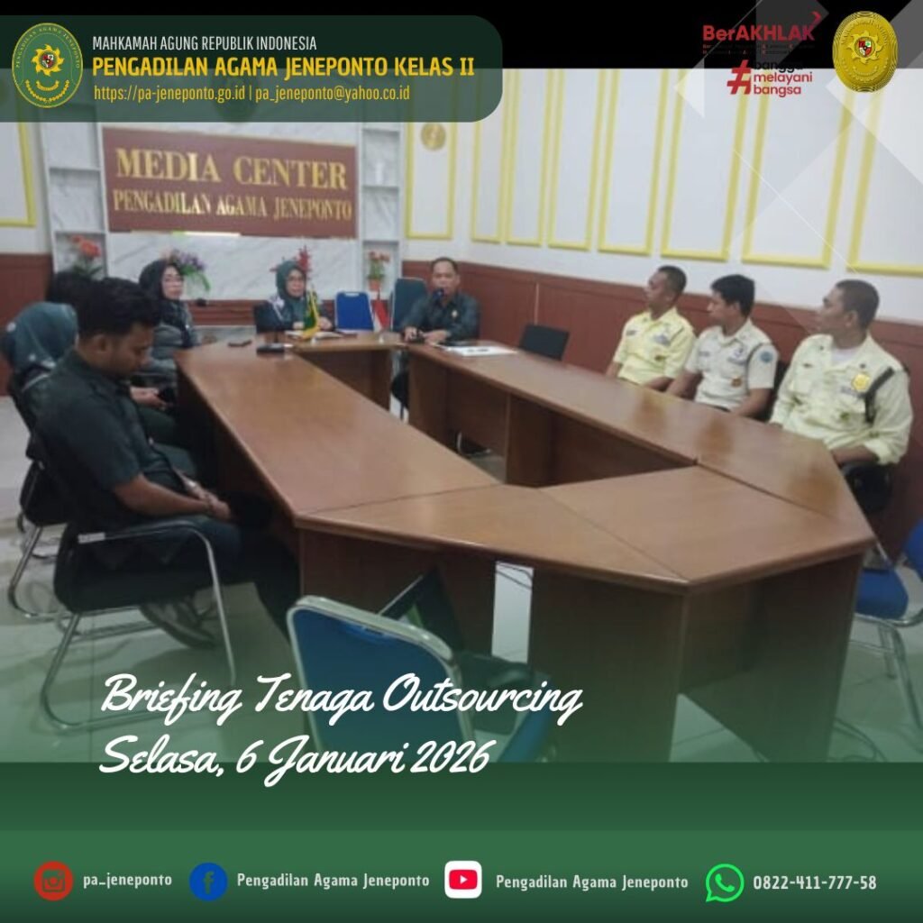 Kami berharap seluruh tenaga outsourcing dapat meningkatkan kinerja, disiplin, dan profesionalisme demi mendukung pelayanan prima kepada masyarakat. Keberadaan seluruh tenaga outsourcing sangat penting dalam mendukung kelancaran tugas dan citra Pengadilan Agama Jeneponto.