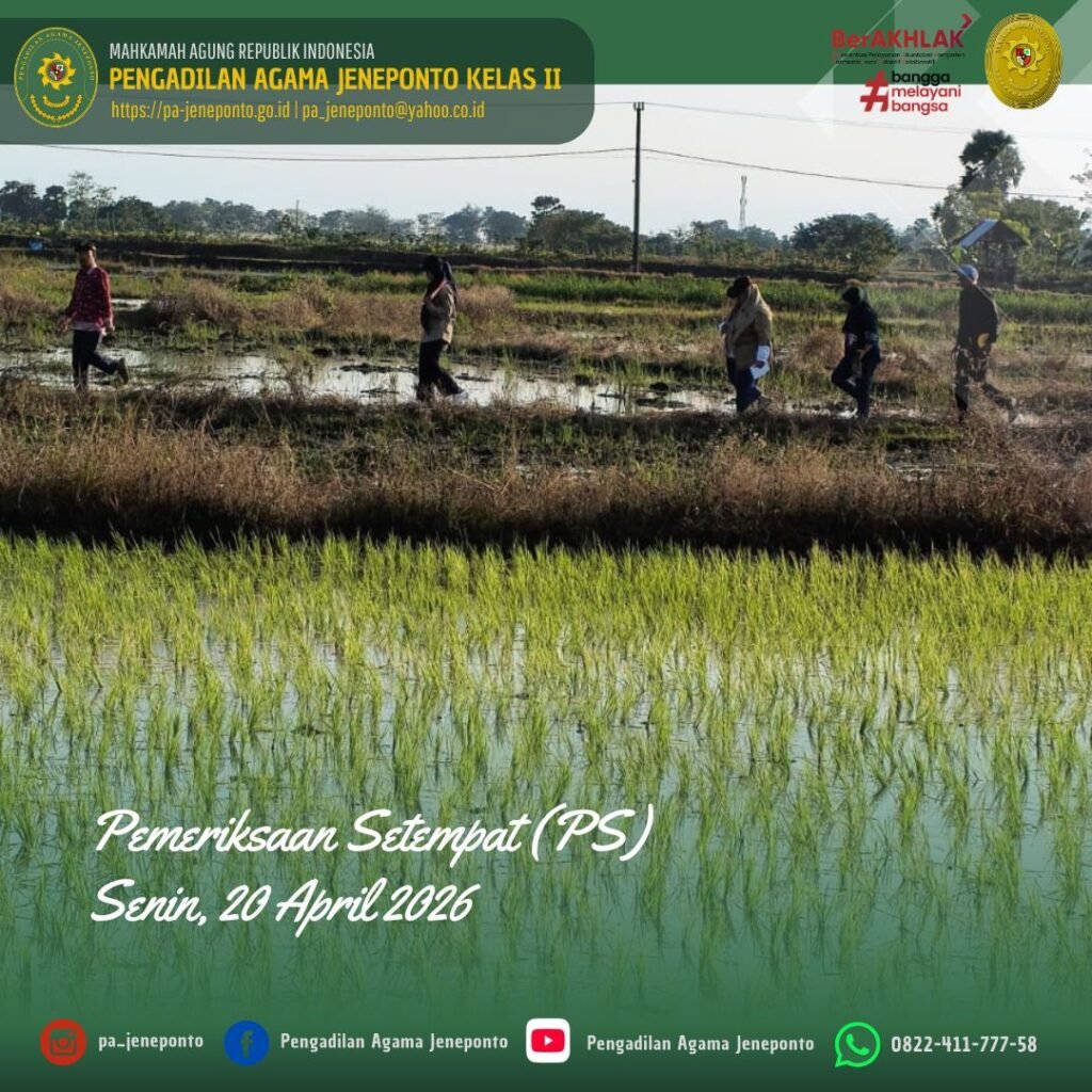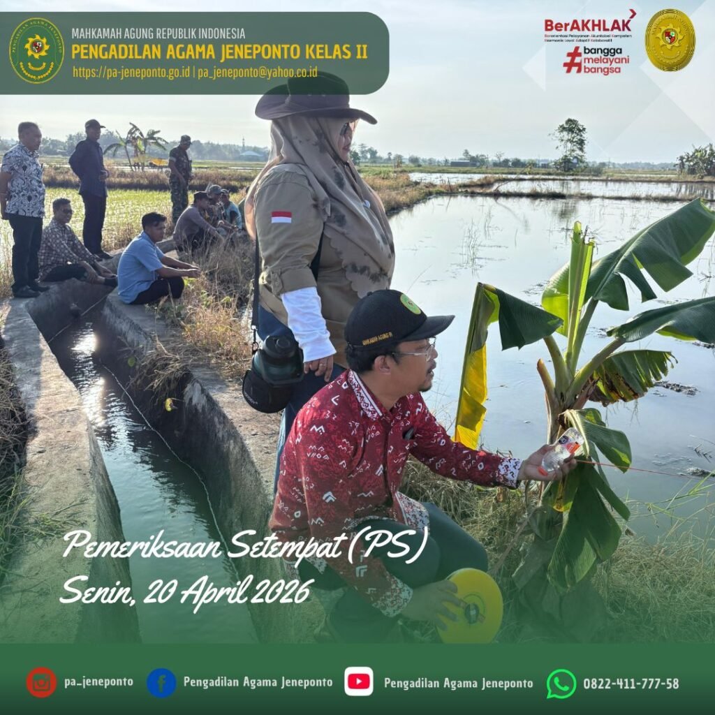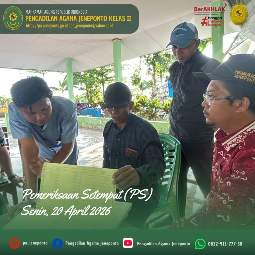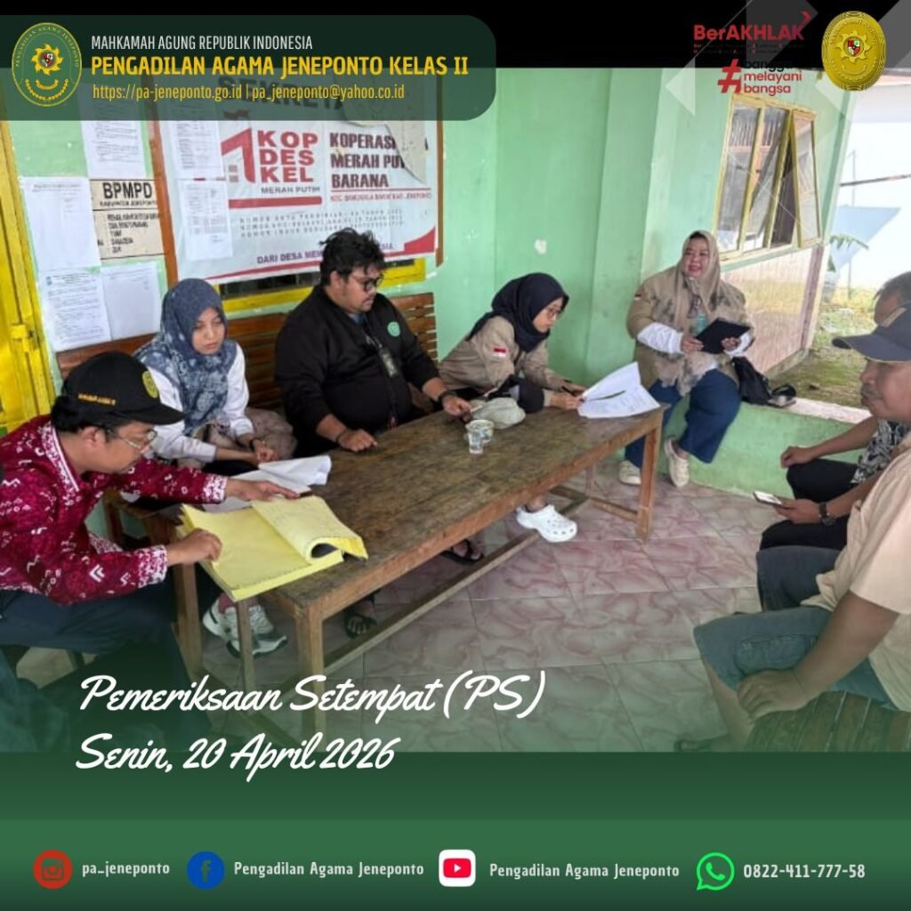 Jeneponto, Senin (20 April 2026) — Pengadilan Agama Jeneponto melaksanakan kegiatan Pemeriksaan Setempat (PS) pada Senin, 20 April 2026, bertempat di Dusun Bontoparang, Desa Barana, Kecamatan Bangkala Barat, Kabupaten Jeneponto.