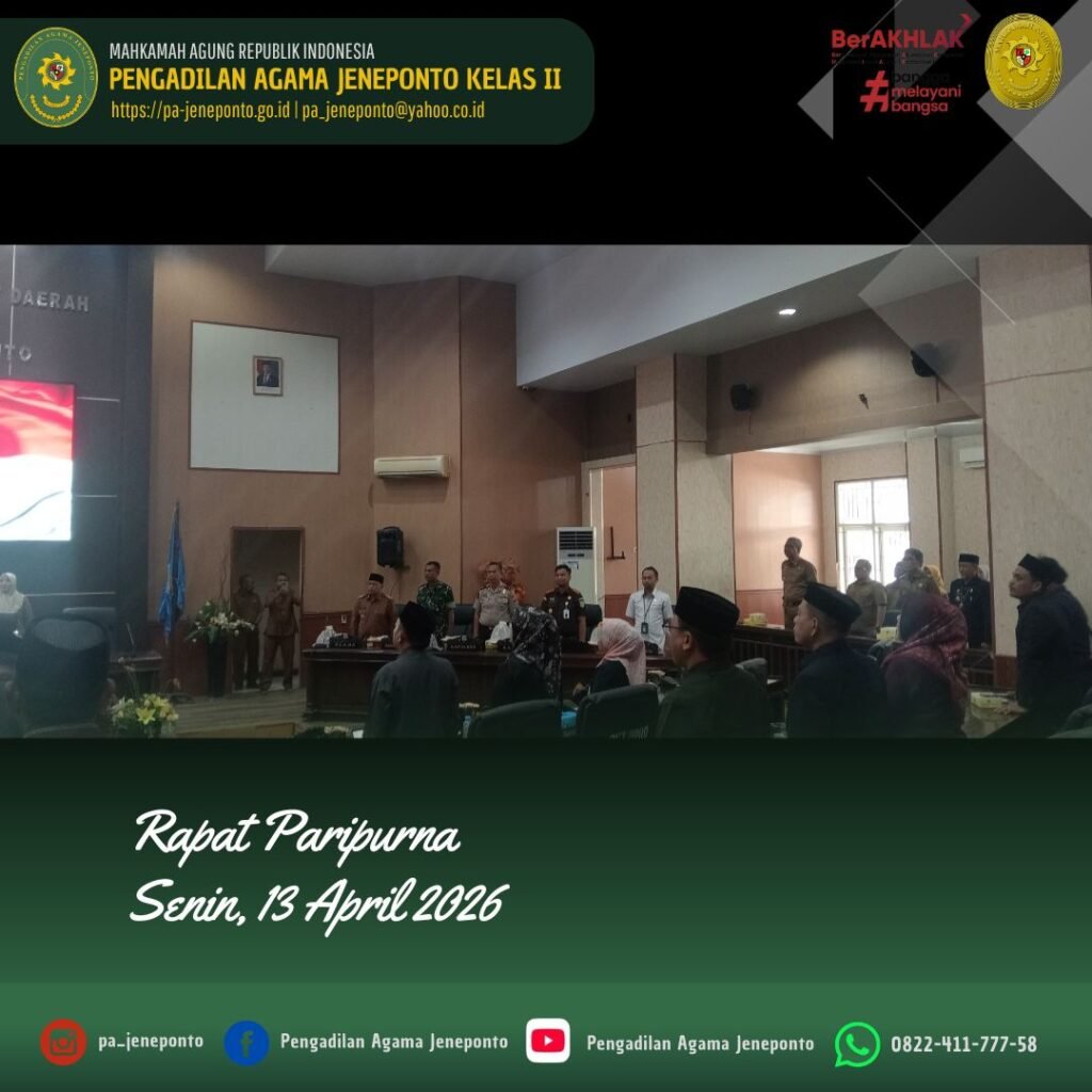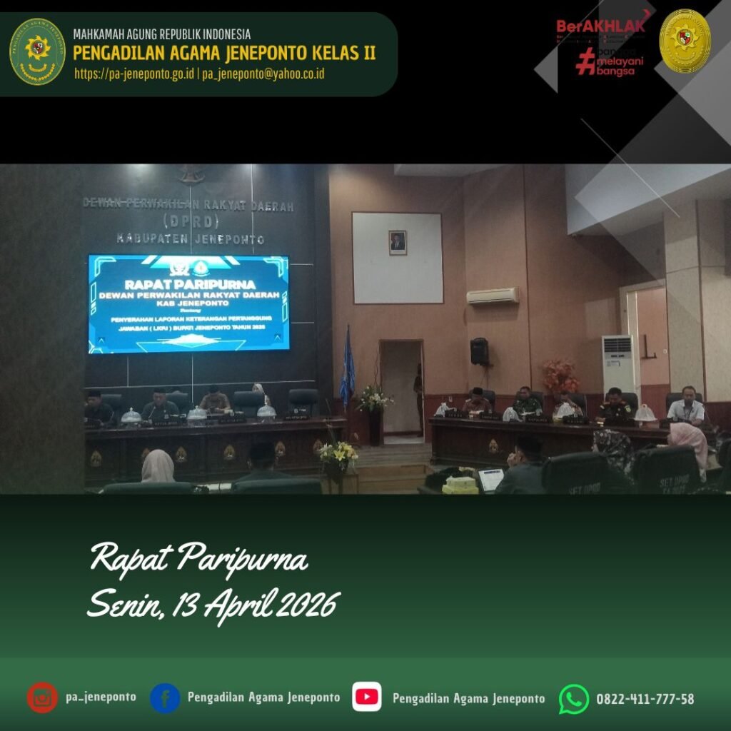 Jeneponto, Senin (13 April 2026) — Pengadilan Agama Jeneponto menghadiri Rapat Paripurna Dewan Perwakilan Rakyat Daerah (DPRD) Kabupaten Jeneponto yang dilaksanakan pada Senin, 13 April 2026, pukul 13.00 WITA hingga selesai, bertempat di Ruang Rapat Paripurna DPRD Kabupaten Jeneponto.