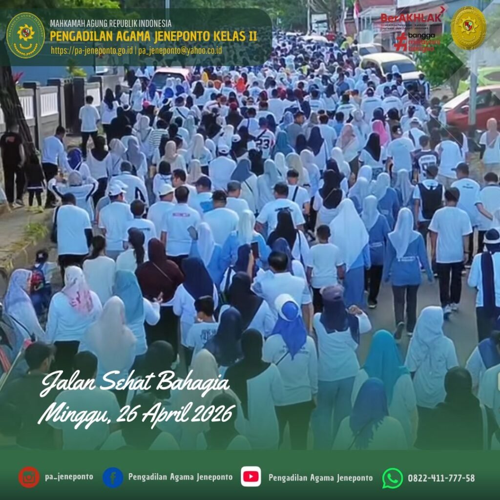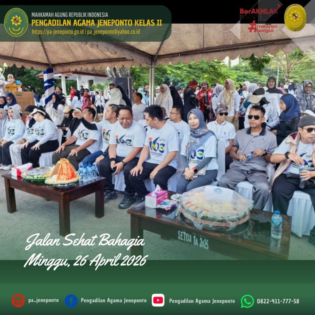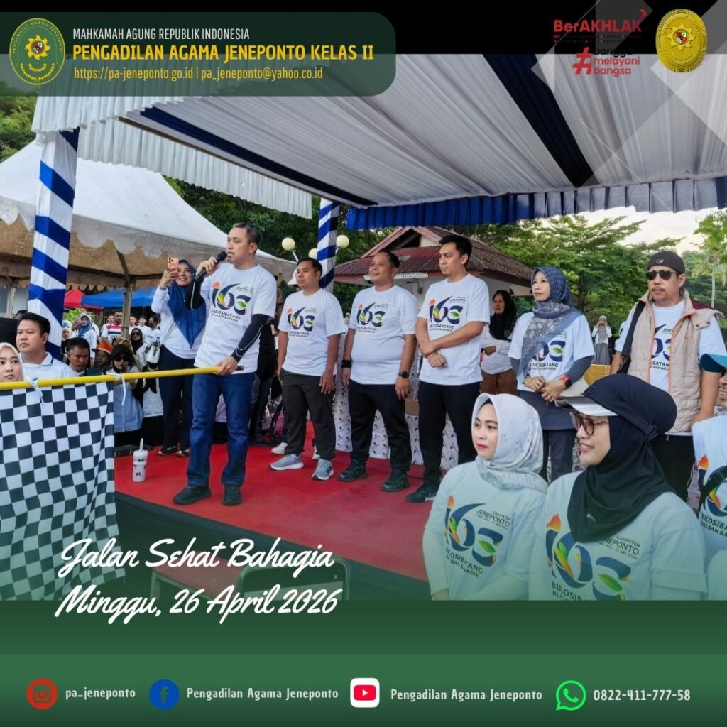 Jeneponto, Minggu (26 April 2026) — Ketua Pengadilan Agama Jeneponto, Fadilah, S.Ag., M.H., menghadiri kegiatan Jalan Sehat Bahagia (JSB) yang dilaksanakan pada Minggu pagi di Taman Turatea, Kabupaten Jeneponto.
