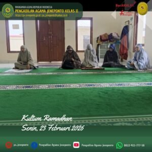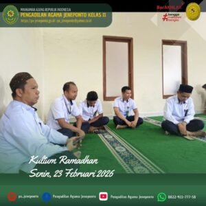 Kultum hari ini Ba’da Dhuhur dengan pembawa acara Abdul Muiz., S.H.I.,M.H., dibawakan oleh Fadilah, S.Ag.,M.H., dengan ini menyampaikan Alhamdulillahi rabbil ‘alamin, segala puji bagi Allah SWT yang telah memberikan kita kesempatan untuk bertemu kembali dengan bulan suci Ramadhan, bulan penuh rahmat, ampunan, dan keberkahan. Ramadhan adalah bulan yang sangat istimewa. Dalam bulan ini, memperbanyak berdoa, Allah SWT membuka pintu surga, menutup pintu neraka, dan melipatgandakan pahala setiap amal kebaikan. Oleh karena itu, sudah sepatutnya kita memanfaatkan Ramadhan dengan sebaik-baiknya.