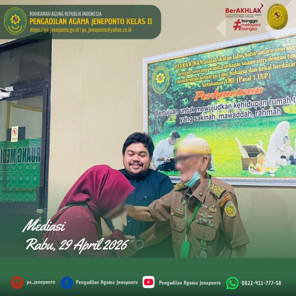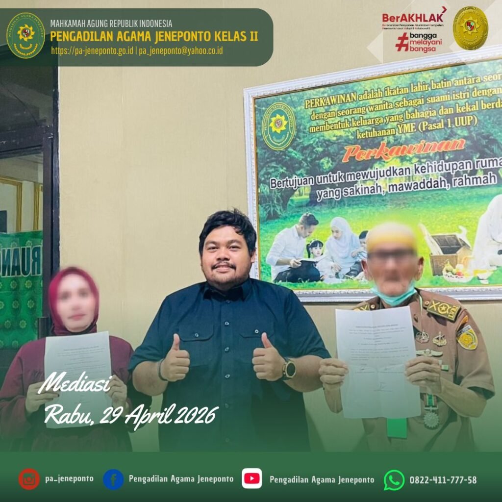 Jeneponto, Rabu (29 April 2026) — Pengadilan Agama Jeneponto kembali mencatat keberhasilan dalam penyelesaian perkara melalui jalur mediasi. Bertempat di Ruang Mediasi Pengadilan Agama Jeneponto, Hakim Pengadilan Agama Jeneponto, Muhammad Arif, S.H., M.H., selaku mediator berhasil memediasi perkara perceraian (Cerai Talak) Nomor 178/Pdt.G/2026/PA.Jnp.