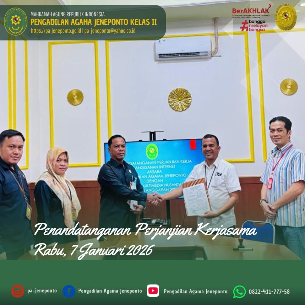 Rabu pagi, 11.00 Wita s.d. selesai, bertempat di Media Center Pengadilan Agama Jeneponto, Wakil Ketua, Sekretaris dan Kasubag. PTIP Pengadilan Agama Jeneponto, melaksanakan kegiatan Penandatanganan Perjanjian Kerja Sama Langganan Internet antara Pengadilan Agama Jeneponto dengan PT. Julia Multimedia Nusantara Tahun Anggaran 2026 sebagai bentuk komitmen dalam penyediaan layanan jaringan internet yang andal dan berkesinambungan. Kegiatan ini bertujuan untuk mendukung kelancaran pelayanan administrasi dan peningkatan kualitas layanan berbasis teknologi informasi di lingkungan Pengadilan Agama Jeneponto.