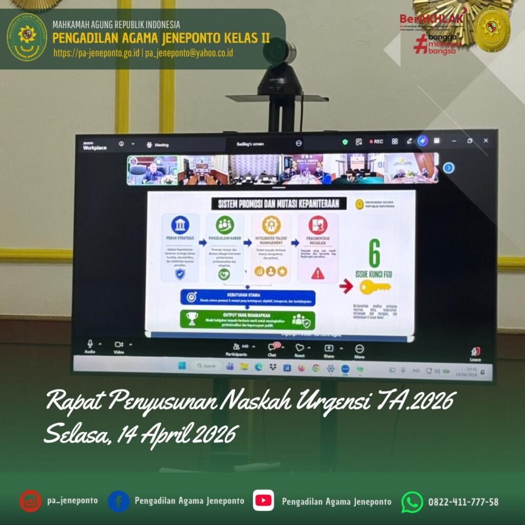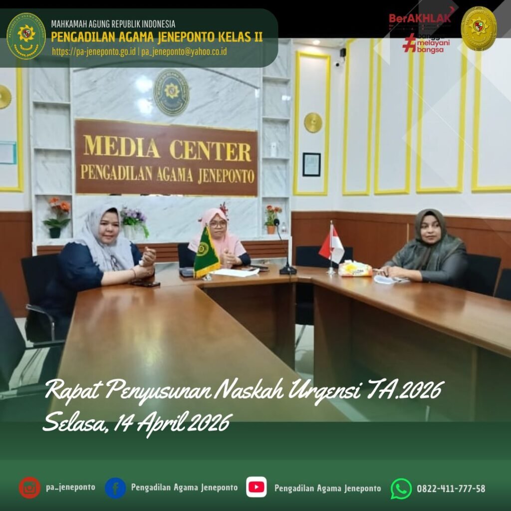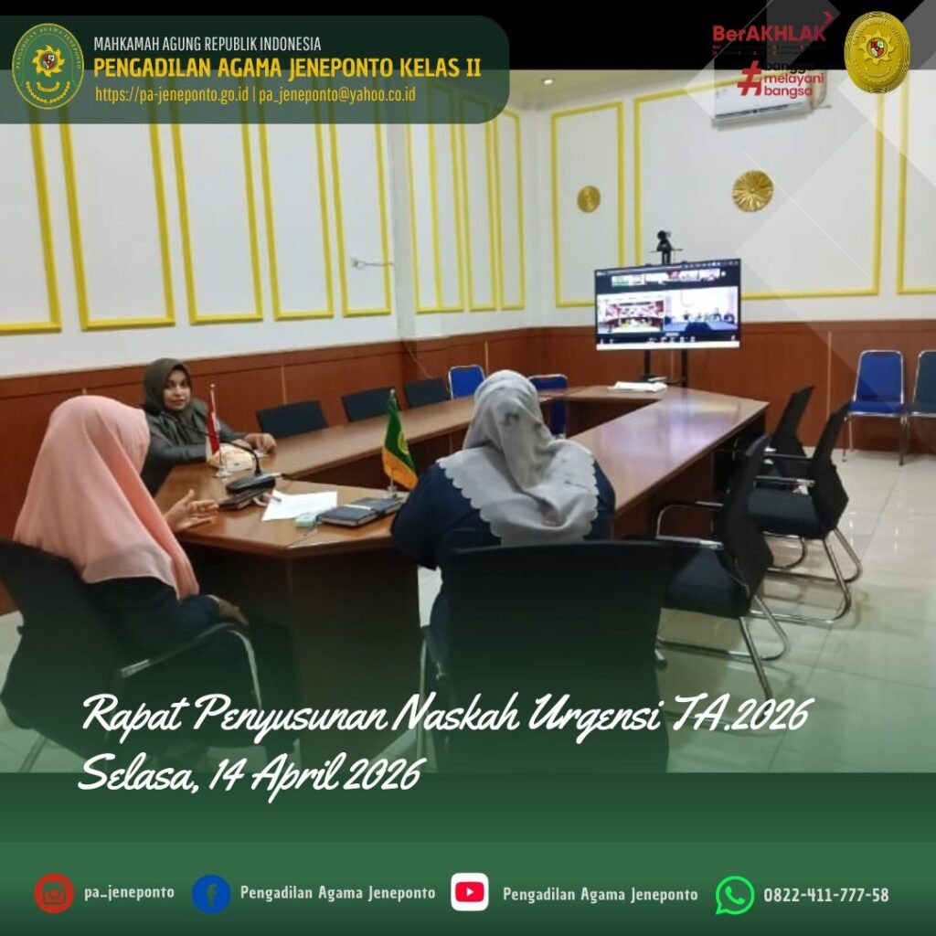 Jeneponto, Selasa (14 April 2026) — Pengadilan Agama Jeneponto mengikuti kegiatan Rapat Penyusunan Naskah Urgensi Tahun Anggaran 2026 yang dilaksanakan pada Selasa pagi, pukul 10.00 WITA hingga selesai, bertempat di Media Center Pengadilan Agama Jeneponto.