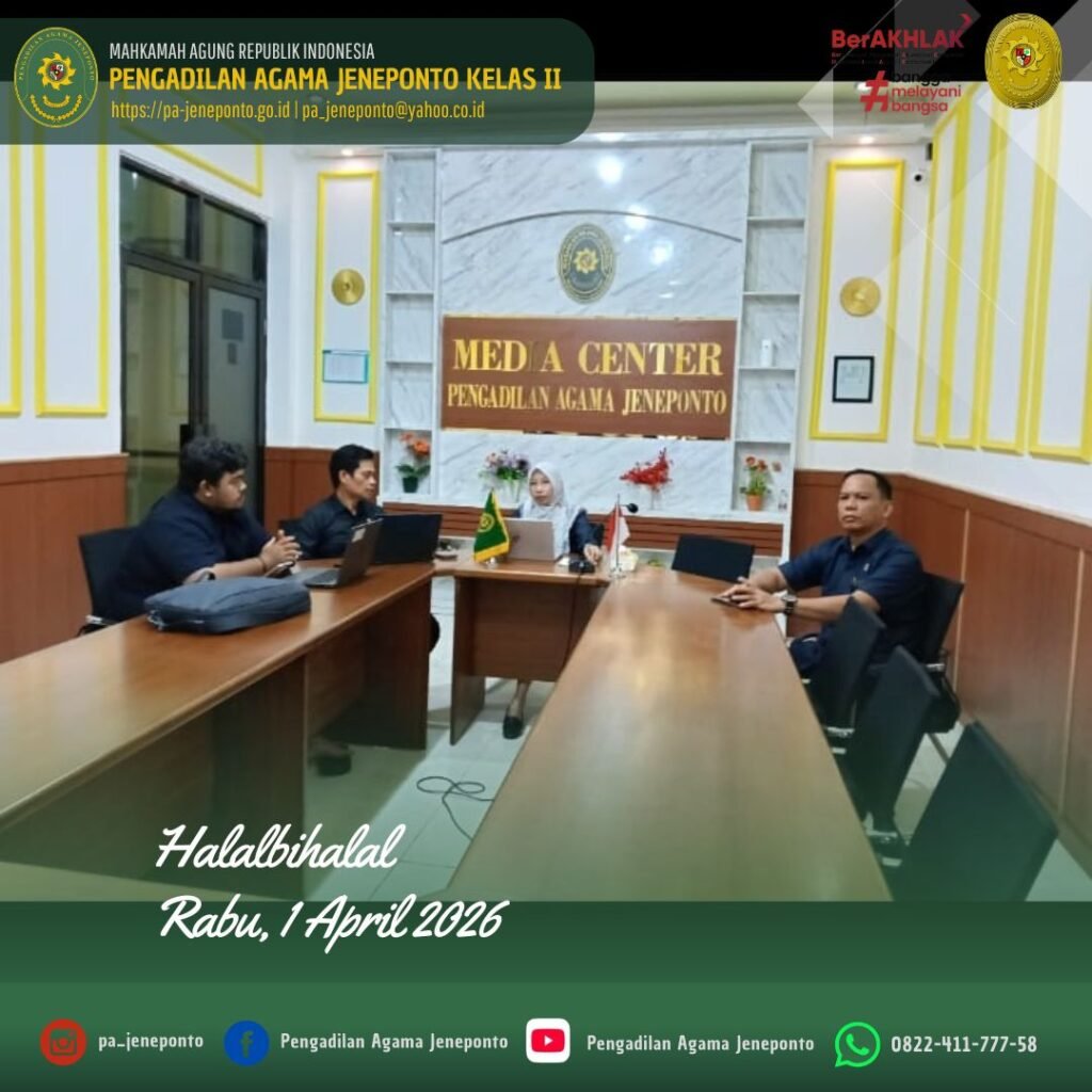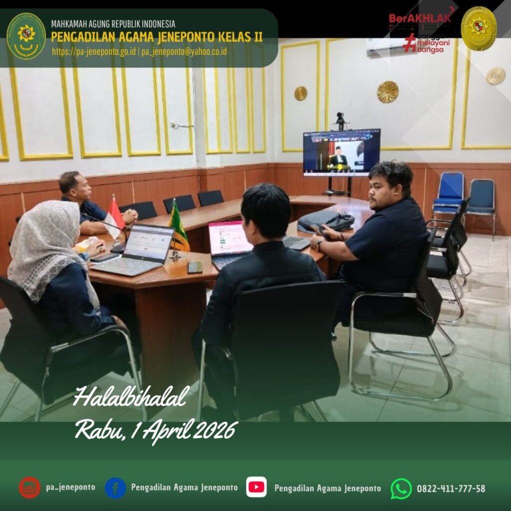 Masih dalam nuansa hangat Idul Fitri 1447 H, aparatur Pengadilan Agama (PA) Jeneponto mengikuti acara Halal Bihalal yang diselenggarakan oleh Direktorat Jenderal Badan Peradilan Agama (Dirjen Badilag) Mahkamah Agung RI secara daring pada hari ini. Kegiatan yang dilaksanakan melalui media Zoom Meeting tersebut diikuti oleh pimpinan, hakim, serta seluruh pegawai PA Jeneponto dari ruang media center. Acara ini merupakan momentum silaturahmi nasional bagi seluruh warga peradilan agama di bawah naungan Mahkamah Agung RI.