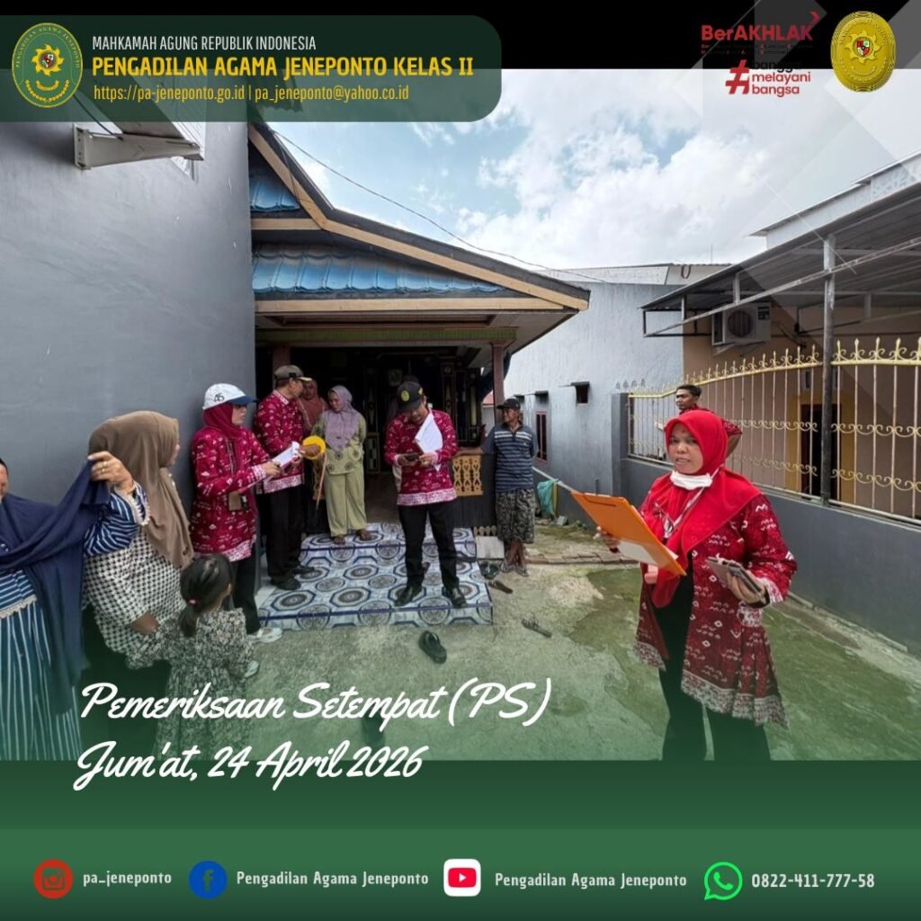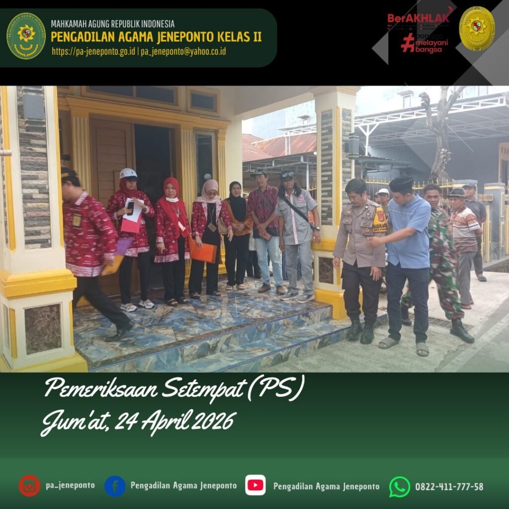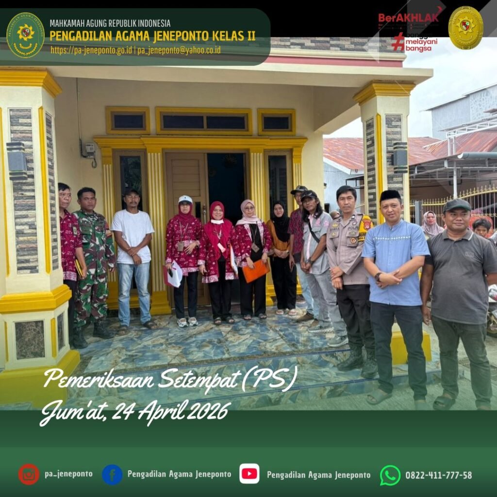 Jeneponto, Jum’at (24 April 2026) — Pengadilan Agama Jeneponto melaksanakan kegiatan Pemeriksaan Setempat (PS) pada Jum’at, 24 April 2026, bertempat di Desa Punagayam, Kecamatan Bangkala, Kabupaten Jeneponto.