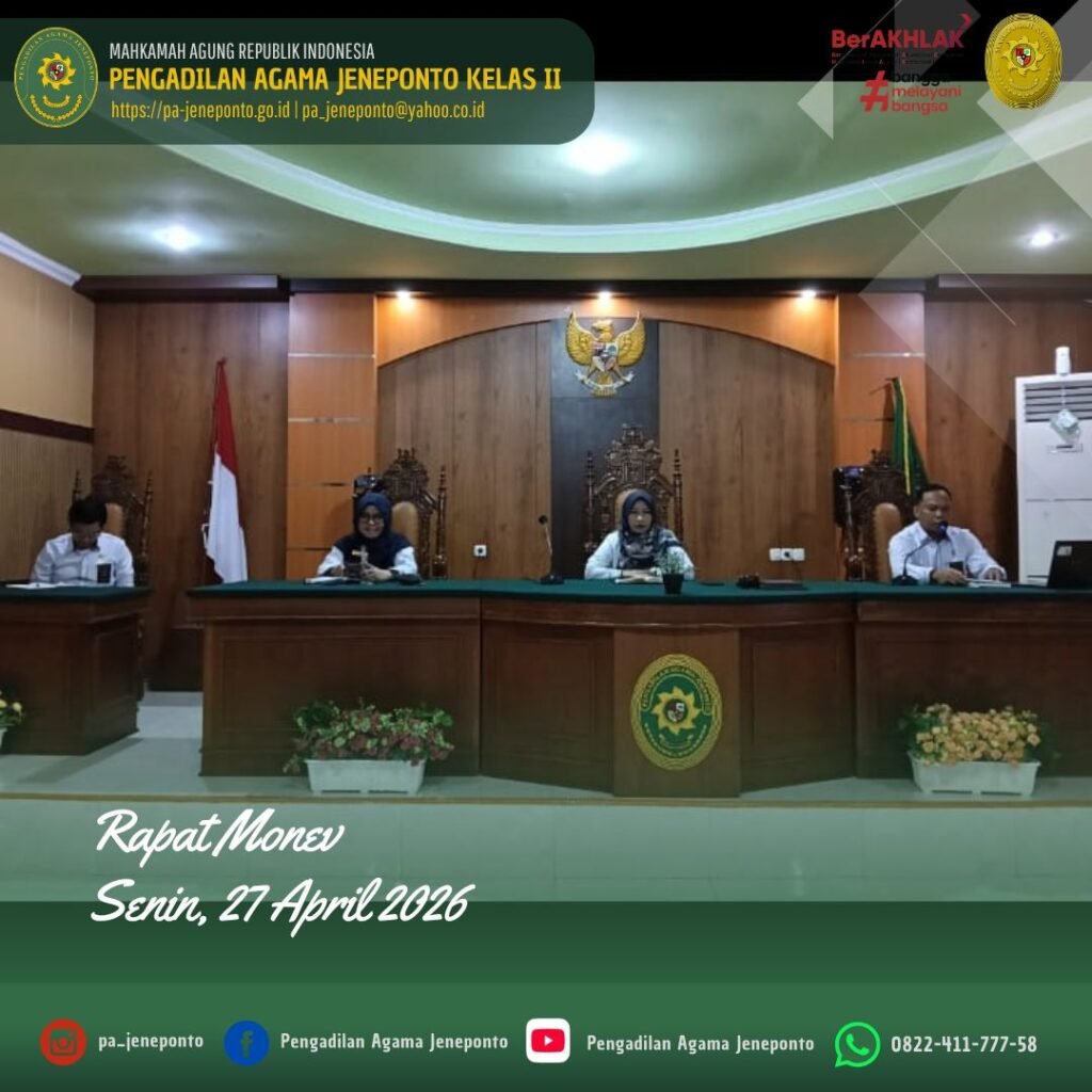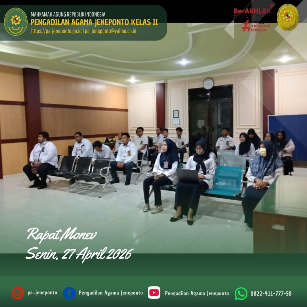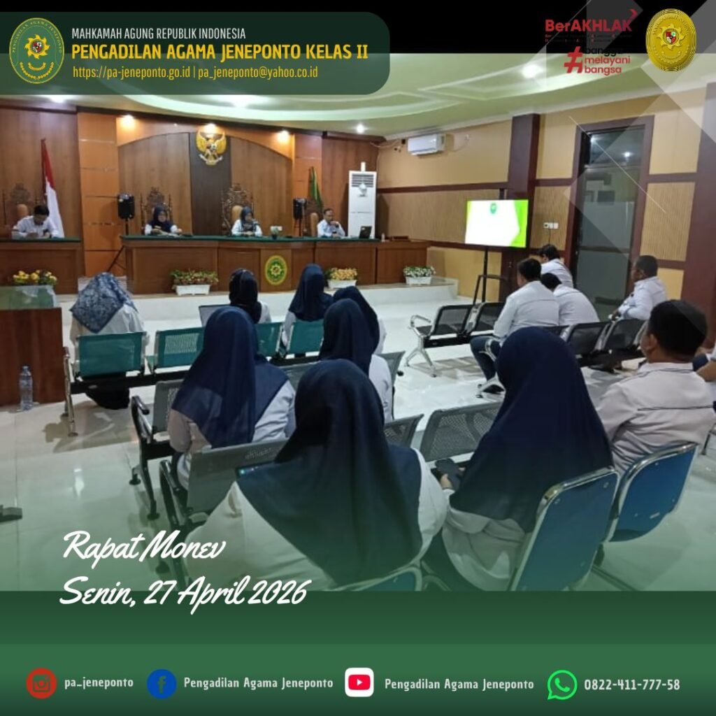 Jeneponto, Senin (27 April 2026) — Pengadilan Agama Jeneponto melaksanakan Rapat Monitoring dan Evaluasi (Monev) Periode Maret–April 2026 pada Senin pagi, pukul 08.30 WITA sampai dengan 11.00 WITA, bertempat di Ruang Aula/Sidang Utama Pengadilan Agama Jeneponto.