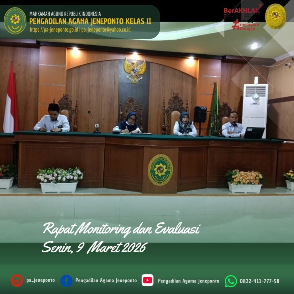 Senin pagi pukul 08.30 s.d. 11.00 Wita, Bertempat di Ruang Aula / Sidang Utama Pengadilan Agama Jeneponto, dilaksanakan Rapat Monitoring dan Evaluasi pada bulan Januari dan Februari tahun 2026, oleh Pimpinan Pengadilan Agama Jeneponto dihadiri unsur pimpinan yaitu Ketua, Wakil Ketua, Hakim, Panitera dan Sekretaris Pengadilan Agama Jeneponto, Pejabat Struktural, Fungsional serta PPPK Pengadilan Agama Jeneponto.
