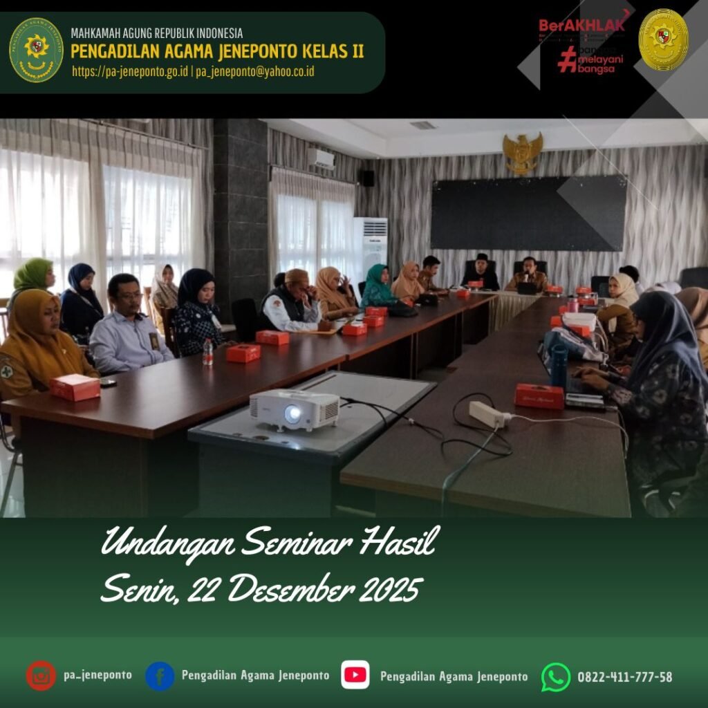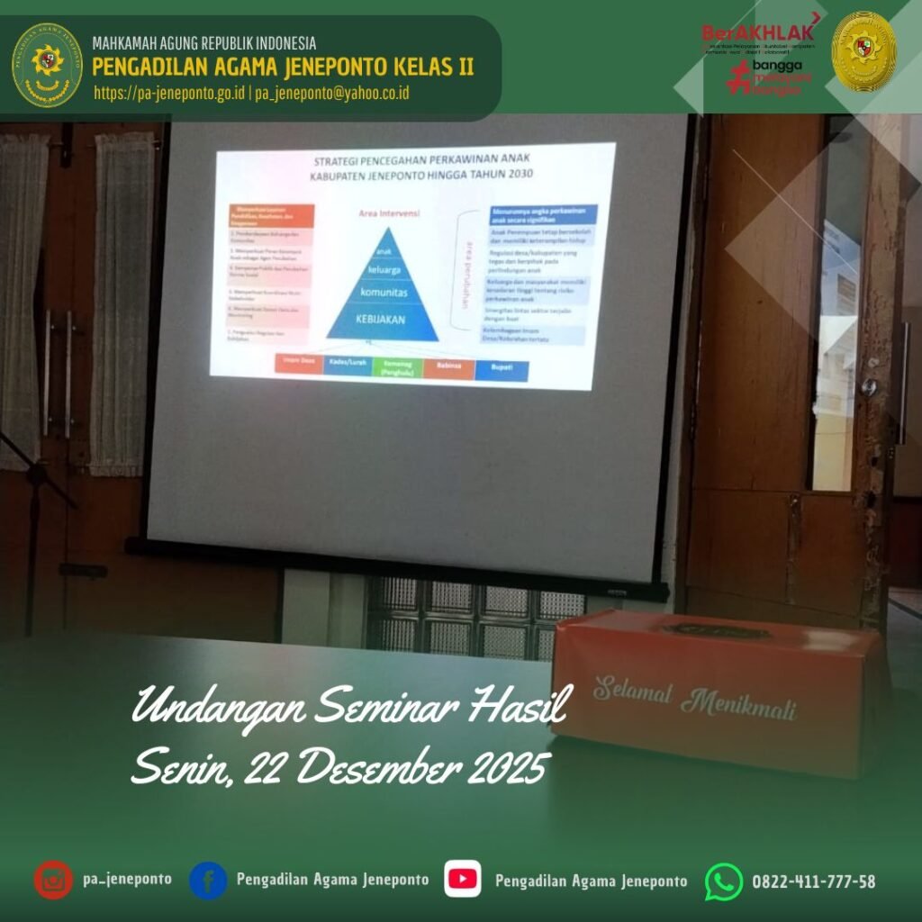 Senin pagi, pukul 08.30 sampai selesai bertempat di Tamarunang Bappeda Kabupaten Jeneponto, Bapak Muhammad Iskandar Zulkarnain, S.H.I., Panitera Muda Gugatan Pengadilan Agama Jeneponto memenuhi undangan Seminar Hasil “Riset Aksi Pencegahan Perkawinan Anak”.