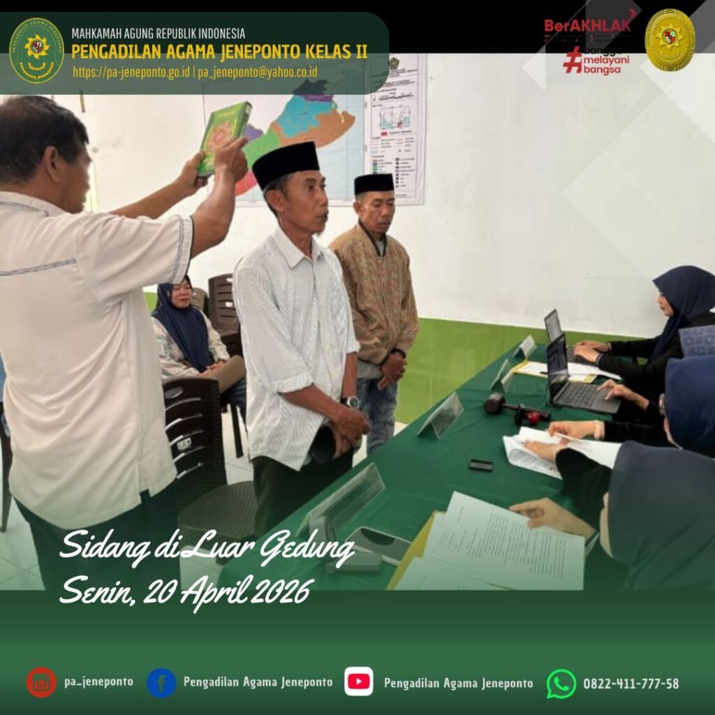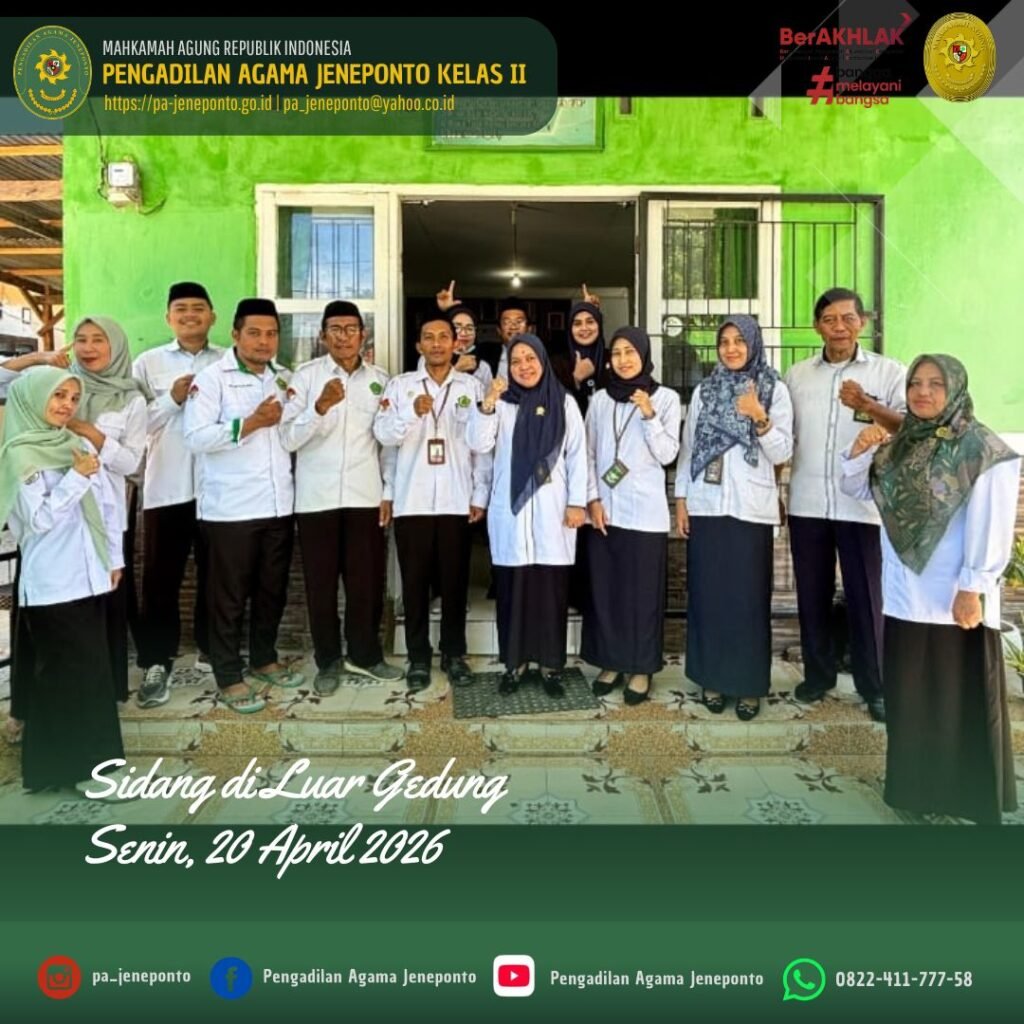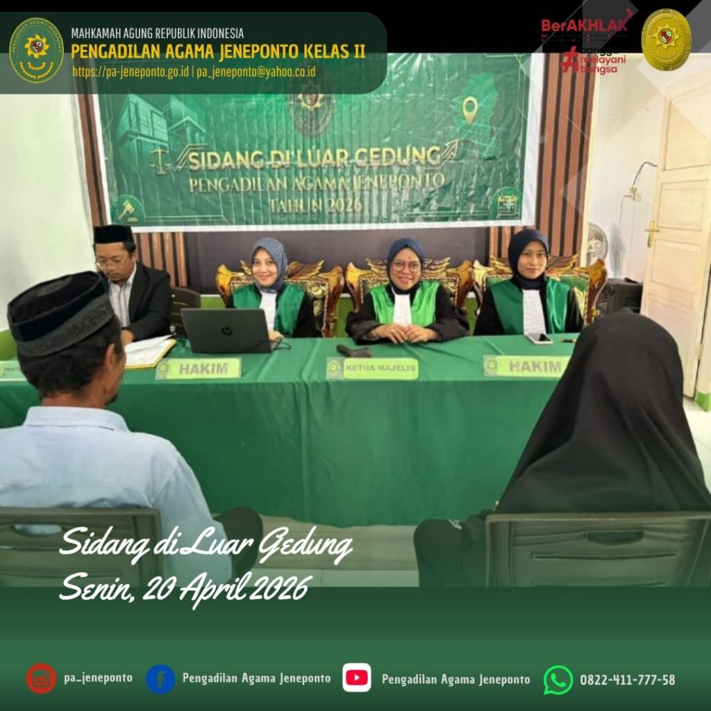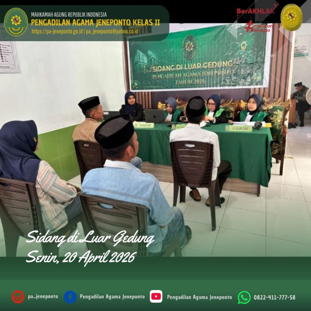 Jeneponto, Senin (20 April 2026) — Pengadilan Agama Jeneponto kembali melaksanakan kegiatan Sidang di Luar Gedung Pengadilan (Sidang Keliling II) yang bertempat di Kantor Urusan Agama (KUA) Kecamatan Arungkeke, Kabupaten Jeneponto.