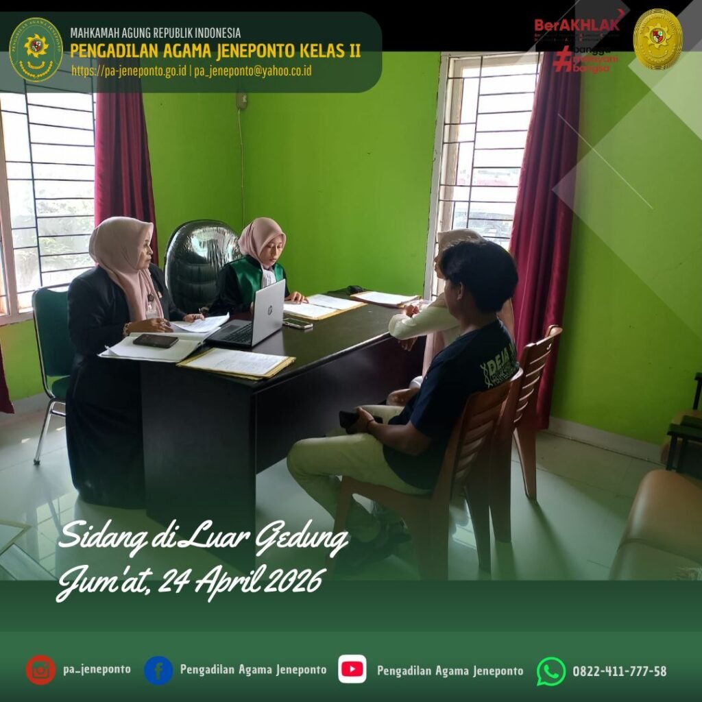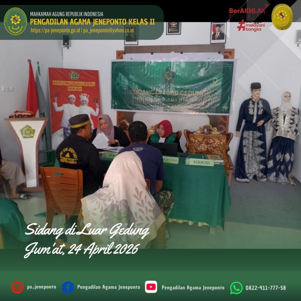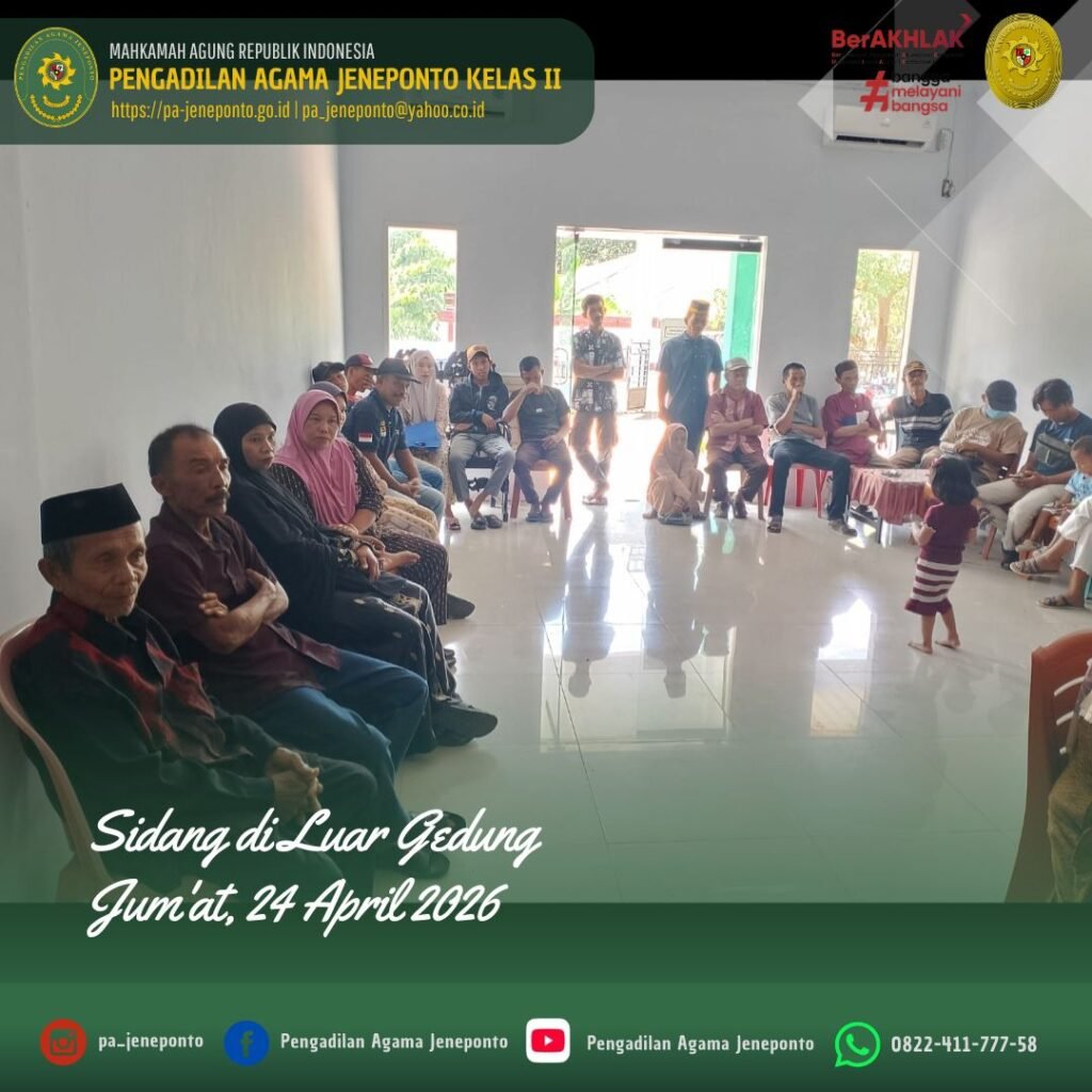 Jeneponto, Jum’at (24 April 2026) — Pengadilan Agama Jeneponto kembali melaksanakan kegiatan Sidang di Luar Gedung Pengadilan (Sidang Keliling III) yang bertempat di Kantor Urusan Agama (KUA) Bangkala, Kecamatan Bangkala, Kabupaten Jeneponto.