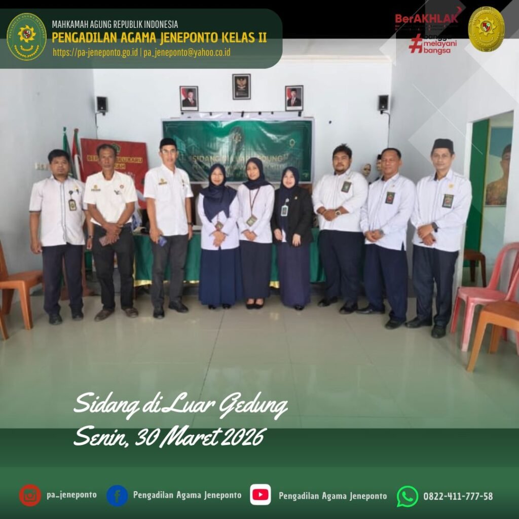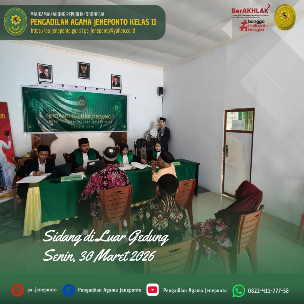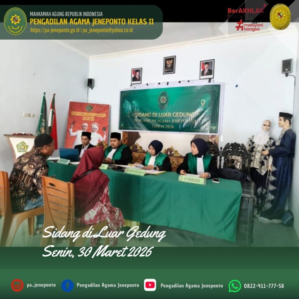 Pengadilan Agama Jeneponto kembali melaksanakan Sidang di Luar Gedung Pengadilan (Sidang Keliling I) di Kantor Urusan Agama (KUA) Kecamatan Bangkala, Kabupaten Jeneponto. Adapun Majelis Hakim yang bersidang yaitu Fadilah, S.Ag.,M.H., didampingi Hakim Anggota Muhammad Arif, S.H., M.H., dan Ulin Nadya Rif’atur Rohmah, S.H. serta Muhyiddin, S.H.I. M.H., dan Hj. Benazir Suroso, S.H., Panitera Pengganti, serta Abdul Muiz, S.H.I.,M.H., dan Nurul Ulum. R, S.E.I., sebagai Admin Sidang Keliling. Adapun perkara yang disidangkan sebanyak 10 perkara, sidang berlangsung dengan tertib tanpa kendala.