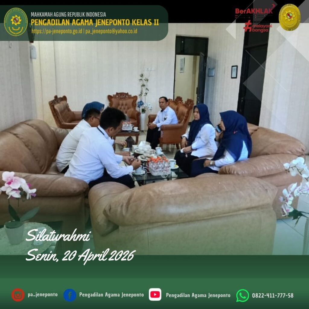 Jeneponto, Senin (20 April 2026) — Pengadilan Agama Jeneponto menerima kunjungan silaturahmi dari Wakil Ketua Pengadilan Negeri Jeneponto yang berlangsung di Kantor Pengadilan Agama Jeneponto.