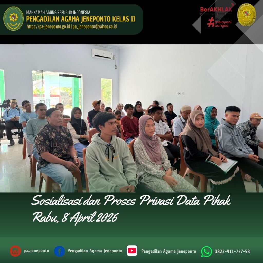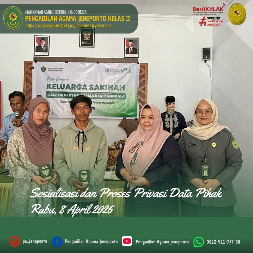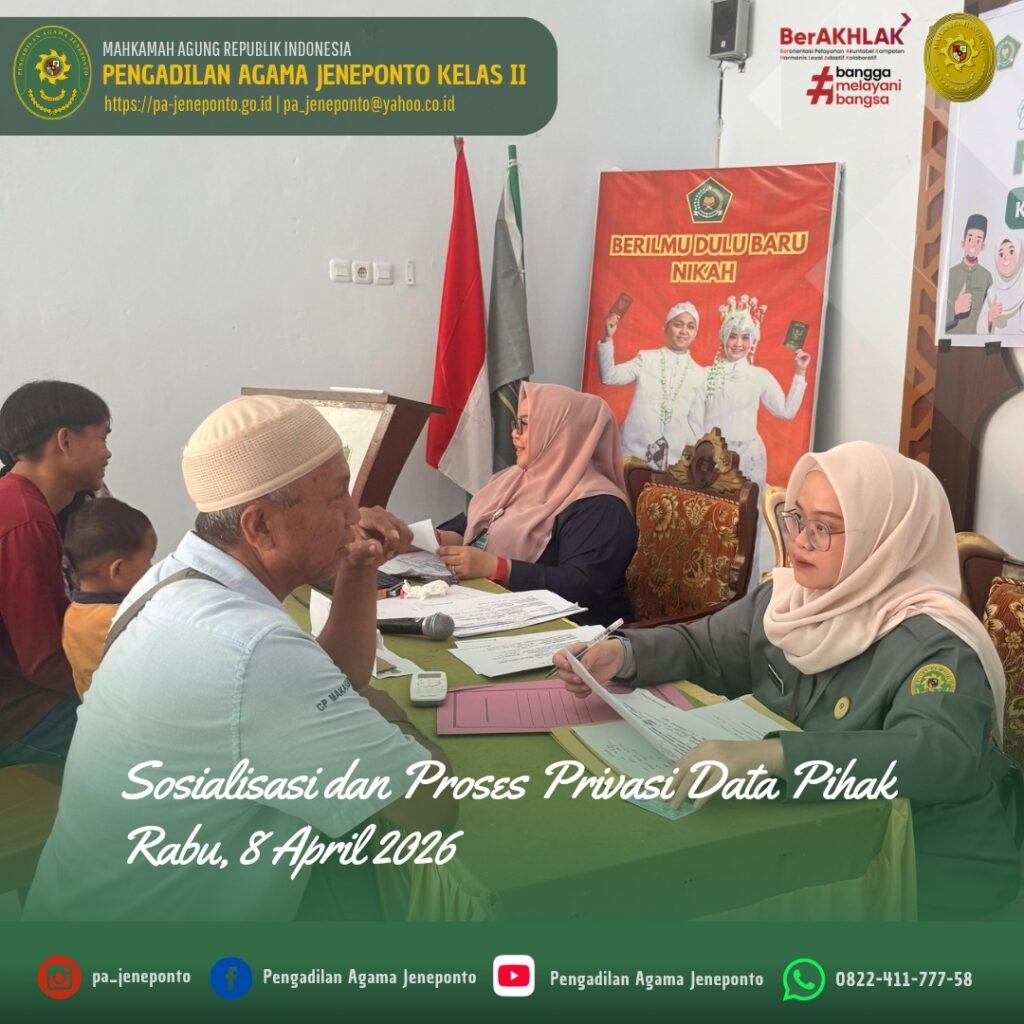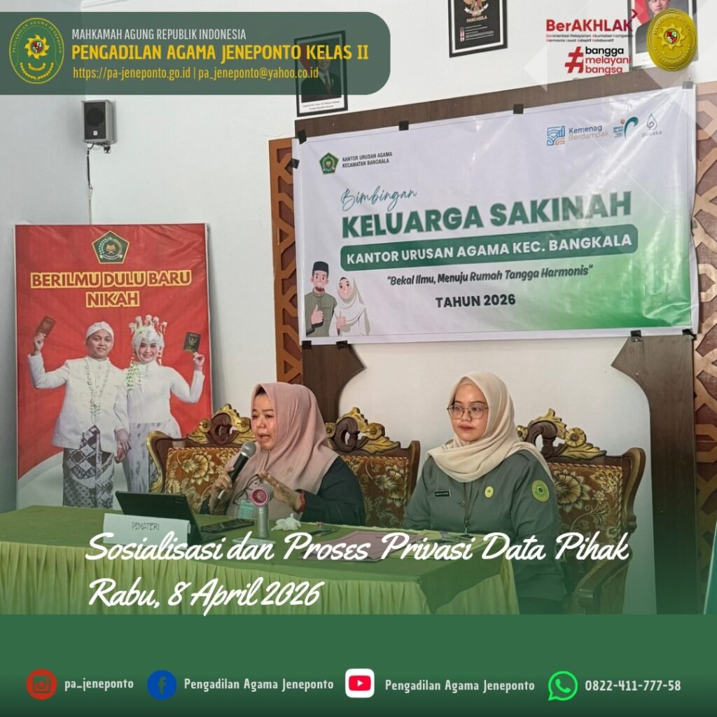 Pengadilan Agama Jeneponto melaksanakan kegiatan sosialisasi di Kantor Urusan Agama (KUA) Kecamatan Bangkala terkait pentingnya pencatatan pernikahan serta proses verifikasi data bagi para pihak dalam perkara itsbat nikah.