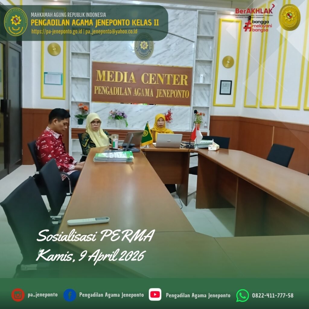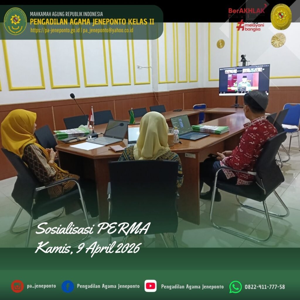 Jeneponto, Kamis (9 April 2026) — Bertempat di Media Center Pengadilan Agama Jeneponto, Ketua, Wakil Ketua, serta Panitera Pengadilan Agama Jeneponto mengikuti kegiatan sosialisasi Peraturan Mahkamah Agung (PERMA) Nomor 4 Tahun 2025 tentang Tata Cara Mengadili Gugatan yang Diajukan oleh Otoritas Jasa Keuangan (OJK) sebagai Upaya Perlindungan Konsumen. Kegiatan tersebut dilaksanakan secara daring melalui aplikasi Zoom.